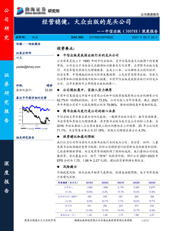 【渤海证券】【20210928】20210928-渤海证券-中信出版-300788.SZ-深度报告:经营稳健,大众出版的龙头公司-23页 行业研究