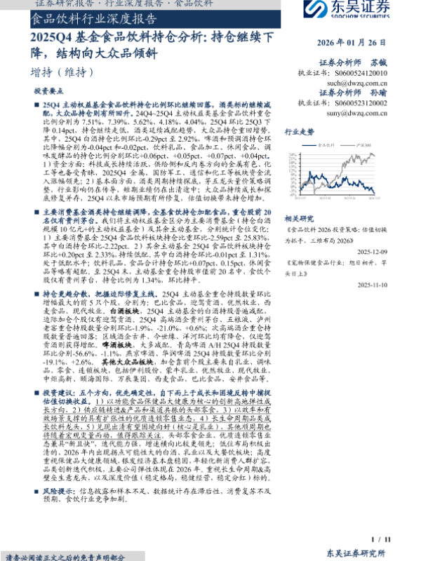【东吴证券】【202601】2025Q4基金食品饮料持仓分析:持仓继续下降,结构向大众品倾斜-11页 证券期货研究报告
