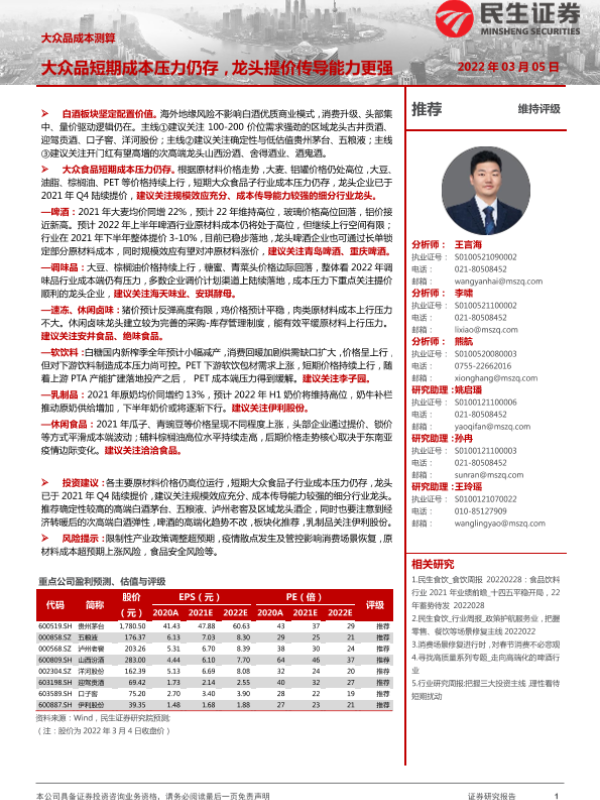 【民生证券】【20220305】食品饮料行业大众品成本测算:大众品短期成本压力仍存,龙头提价传导能力更强-25页 行业研究