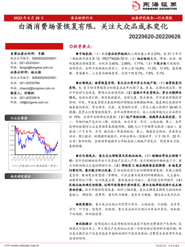 【东海证券】【20220626】20220626-东海证券-食品饮料行业周报:白酒消费场景恢复有限,关注大众品成本变化-16页 行业研究