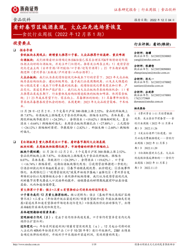 【浙商证券】【20221204】食饮行业周报(2022年12月第1期):看好春节区域酒表现,大众品先选场景恢复-18页 行业研究