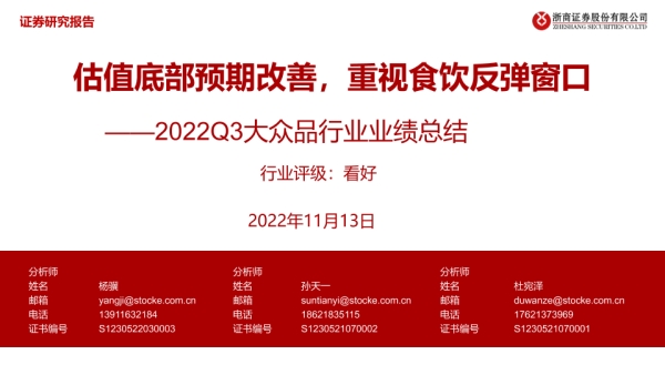 【浙商证券】【20221113】2022Q3大众品行业业绩总结:估值底部预期改善,重视食饮反弹窗口-45页 行业研究