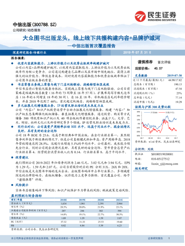 【民生证券】【20190731】20190731-民生证券-中信出版-300788.SZ-首次覆盖报告:大众图书出版龙头,线上线下共振构建内容+品牌护城河-45页 行业研究