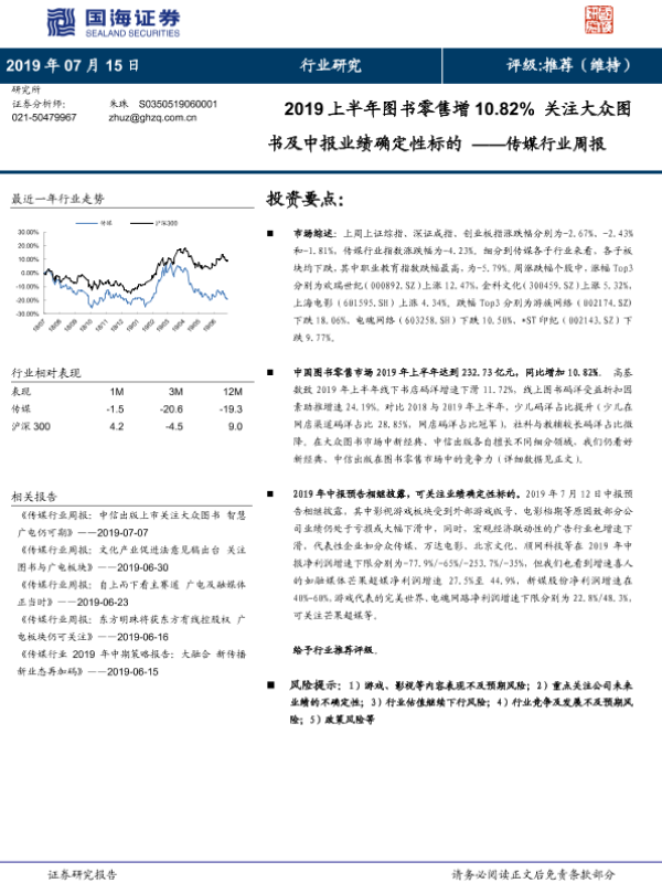 【国海证券】【20190715】2019上半年图书零售增10.82%关注大众图书及中报业绩确定性标的-21页 行业研究