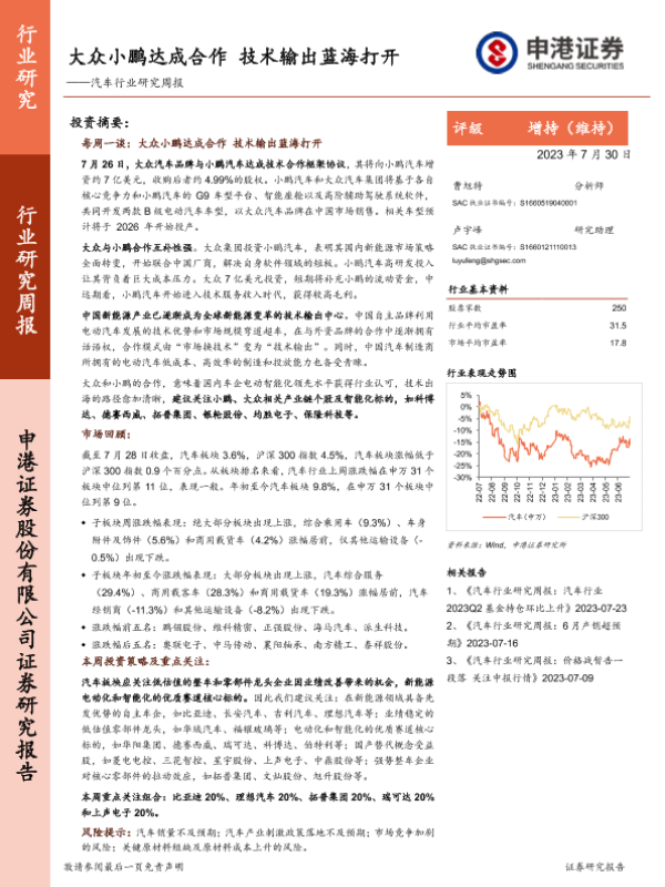 【申港证券】【20230730】20230730-申港证券-汽车行业研究周报:大众小鹏达成合作 技术输出蓝海打开-14页 行业研究