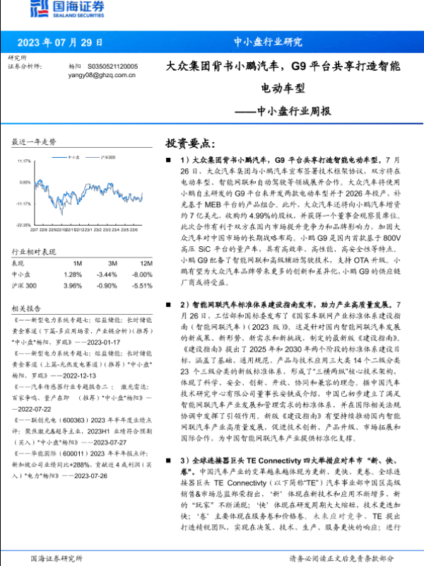 【国海证券】【20230729】中小盘行业周报:大众集团背书小鹏汽车,G9平台共享打造智能电动车型-21页 行业研究