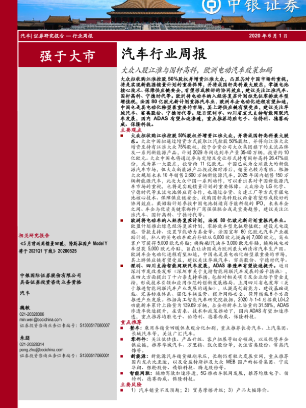【中银证券】【20200601】20200601-中银证券-汽车行业周报:大众入股江淮与国轩高科,欧洲电动汽车政策加码-14页 行业研究
