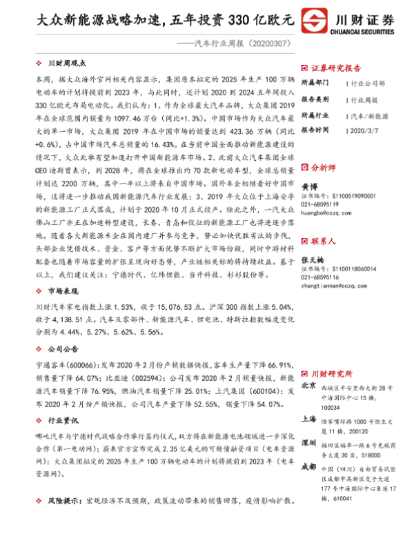 【川财证券】【20200307】20200307-川财证券-汽车行业周报:大众新能源战略加速,五年投资330亿欧元-8页 行业研究