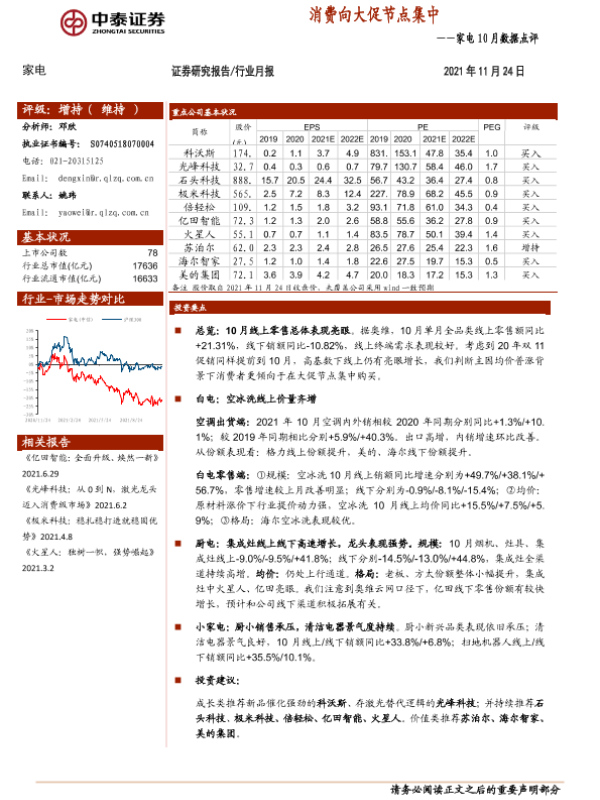 【中泰证券】【20211124】家电10月数据点评:消费向大促节点集中-16页 行业研究