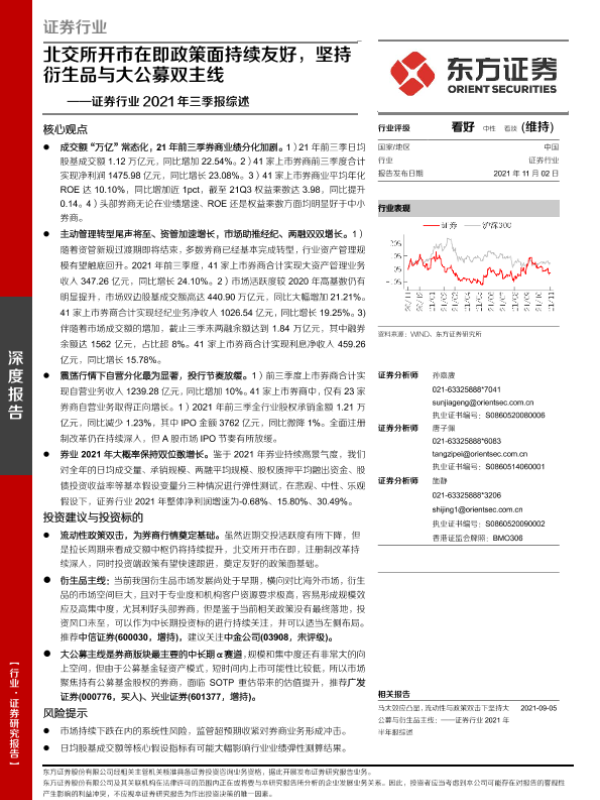 【东方证券】【20211102】证券行业2021年三季报综述:北交所开市在即政策面持续友好,坚持衍生品与大公募双主线-22页 行业研究