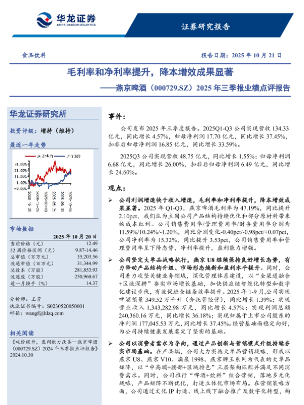 【华龙证券】【202510】毛利率和净利率提升,降本增效成果显著——燕京啤酒(000729.SZ)2025年三季报业绩点评报告-4页 证券期货研究报告