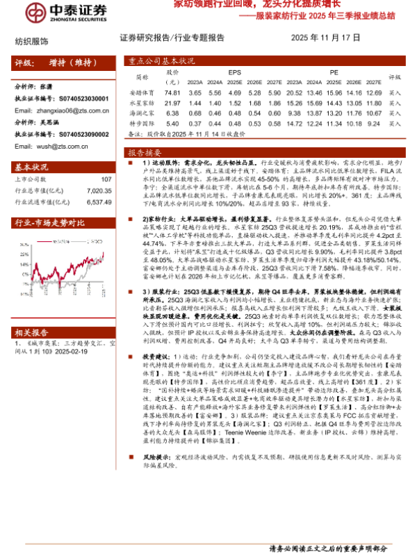 【中泰证券】【202511】家纺领跑行业回暖,龙头分化提质增长——服装家纺行业 2025年三季报业绩总结-9页 证券期货研究报告