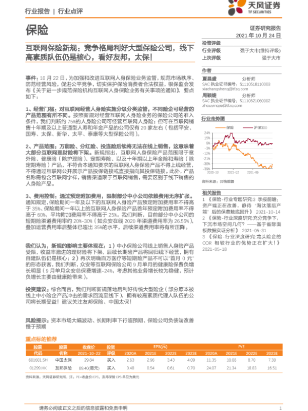 【天风证券】【20211024】互联网保险新规:竞争格局利好大型保险公司,线下高素质队伍仍是核心-2页 行业研究