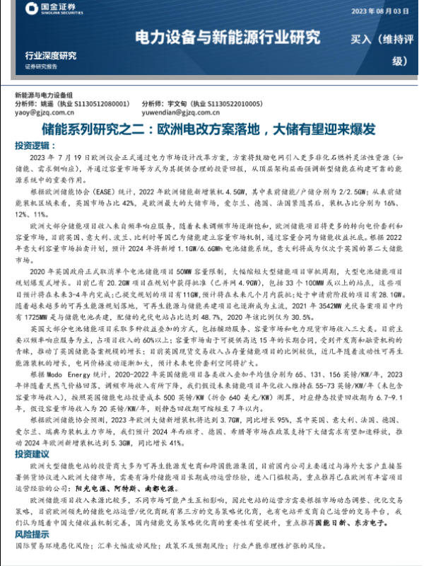 【国金证券】【20230803】储能系列研究之二:欧洲电改方案落地,大储有望迎来爆发-19页 行业研究