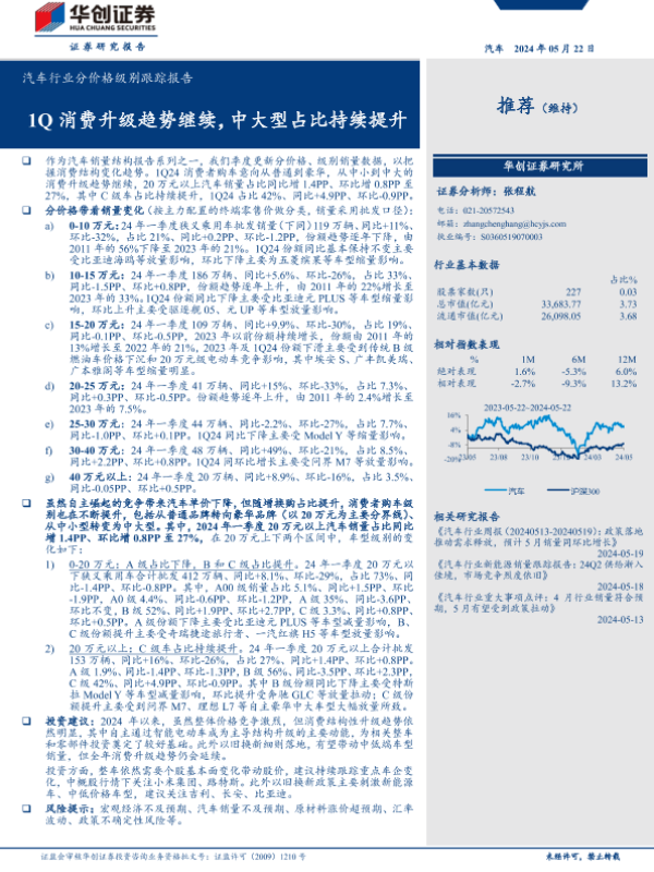 【华创证券】【20240522】汽车行业分价格级别跟踪报告:1Q消费升级趋势继续,中大型占比持续提升-11页 行业研究