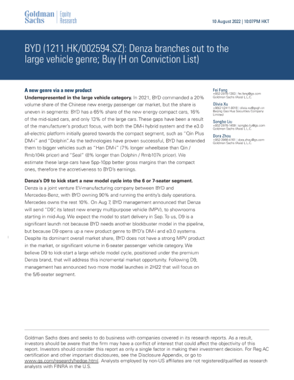 【Goldman Sachs】【20220810】Denza branches out to the large vehicle genre; Buy (H on Conviction List)-10页 行业研究