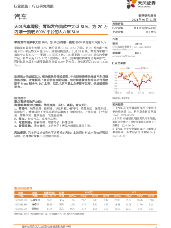 【天风证券】【20240701】天风汽车周报:零跑发布首款中大型SUV,为20万内唯一搭载800V平台的大六座SUV-13页 行业研究