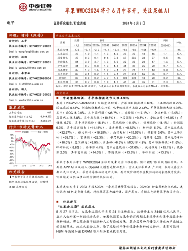 【中泰证券】【20240602】20240602-中泰证券-电子行业周报:苹果WWDC2024将于6月中召开,关注果链AI-16页 行业研究