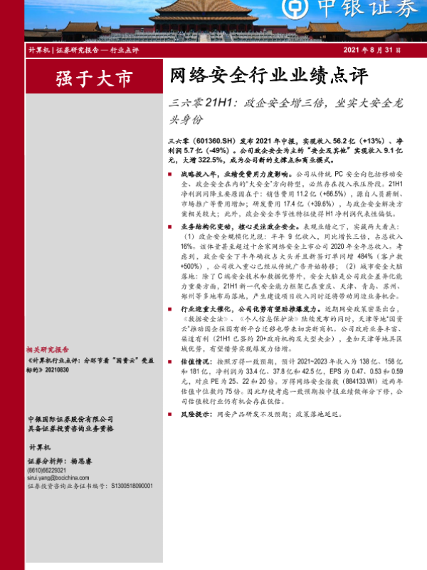 【中银证券】【20210831】20210831-中银证券-网络安全行业业绩点评:三六零21H1:政企安全增三倍,坐实大安全龙头身份-3页 行业研究