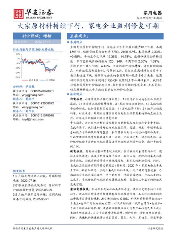【华安证券】【20220711】20220711-华安证券-家用电器行业周报:大宗原材料持续下行,家电企业盈利修复可期-13页 行业研究