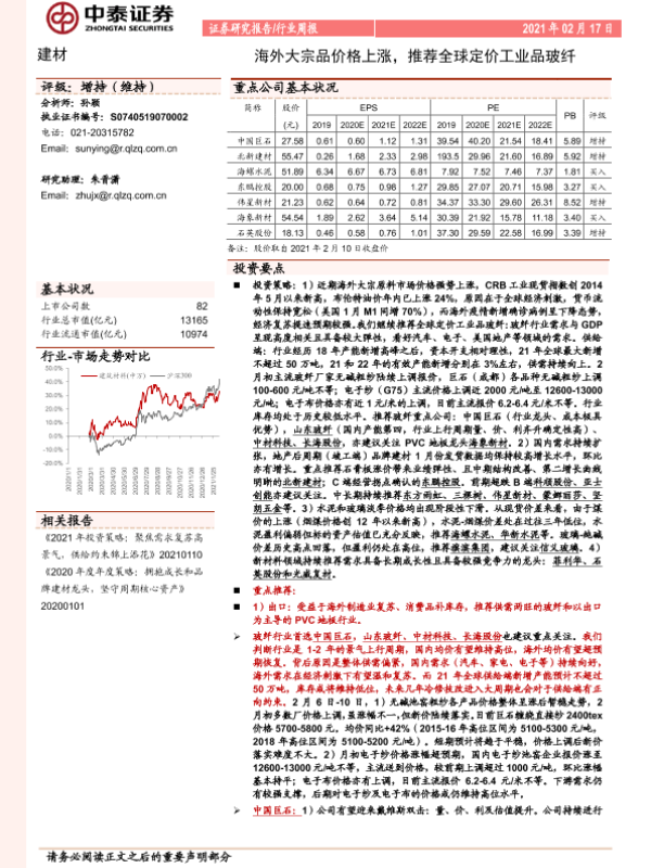 【中泰证券】【20210217】建材行业周报:海外大宗品价格上涨,推荐全球定价工业品玻纤-25页 行业研究