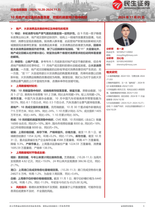 【民生证券】【20241105】行业信息跟踪:10月地产成交面积改善显著,挖掘机销量预计稳中向好-25页 行业研究
