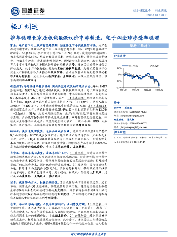 【国盛证券】【20220504】轻工制造:推荐稳增长家居板块&强议价中游制造,电子烟全球渗透率稳增-58页 行业研究