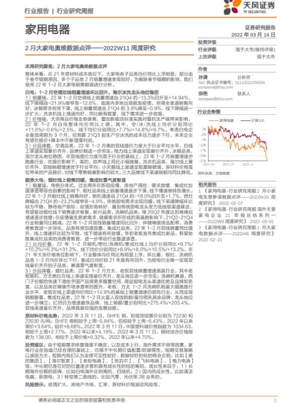 【天风证券】【20220314】家用电器2022W11周度研究:2月大家电奥维数据点评-18页 行业研究