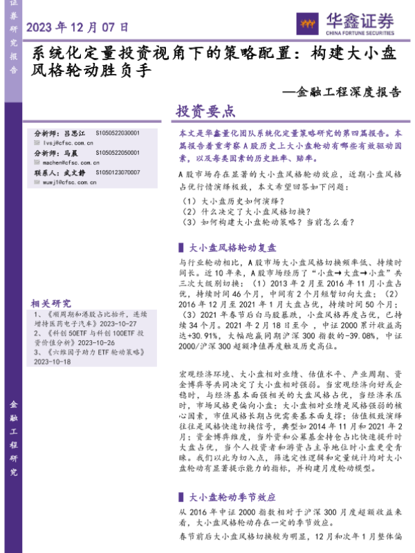 【华鑫证券】【20231207】系统化定量投资视角下的策略配置:构建大小盘风格轮动胜负手-22页 行业研究