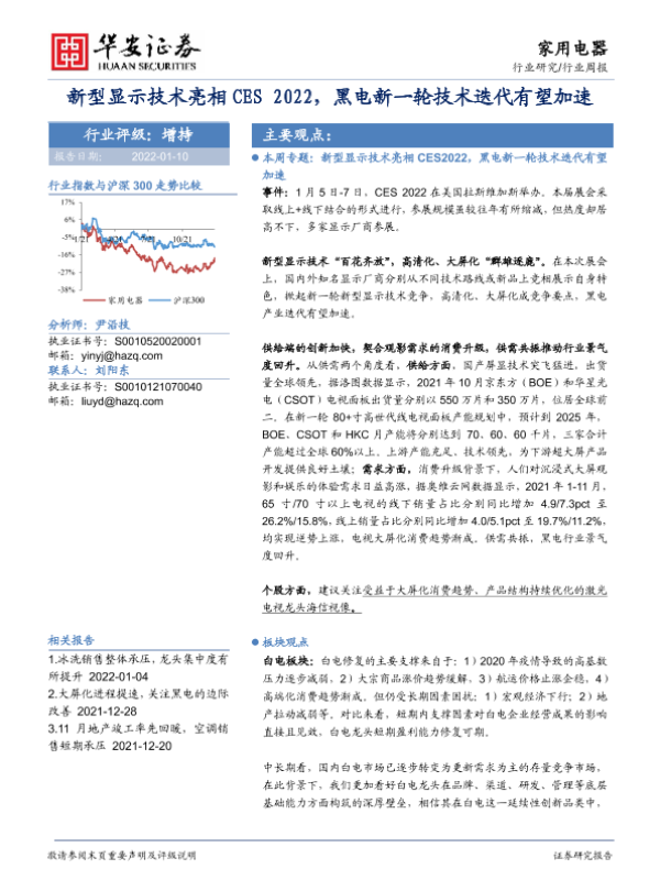 【华安证券】【20220110】家用电器行业周报:新型显示技术亮相CES 2022,黑电新一轮技术迭代有望加速-14页 行业研究