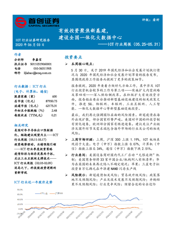 【首创证券】【20200603】20200603-首创证券-ICT行业周报:有效投资聚焦新基建,建设全国一体化大数据中心-14页 行业研究
