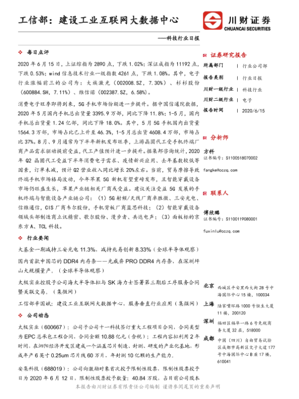 【川财证券】【20200615】科技行业日报:工信部:建设工业互联网大数据中心-4页 行业研究