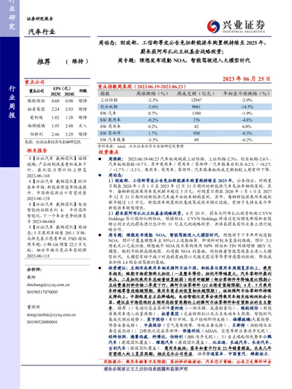 【兴业证券】【20230625】汽车周动态:财政部、工信部等发公告免征新能源车购置税持续至2025年,蔚来获阿布扎比主权基金战略投资;周专题:理想发布通勤NOA,智能驾驶进入大模型时代-17页 行业研究
