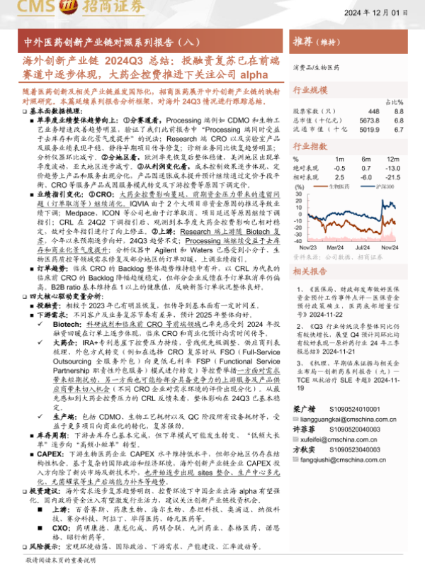 【海通证券】【20241201】海外创新产业链2024Q3总结:投融资复苏已在前端赛道中逐步体现,大药企控费推进下关注公司alpha-14页 行业研究