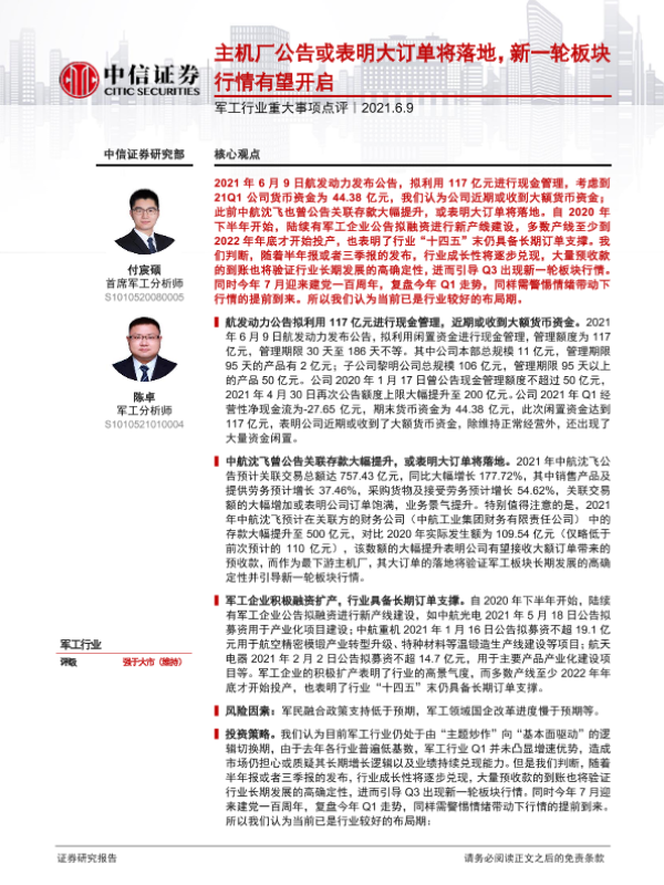 【中信证券】【20210609】20210609-中信证券-军工行业重大事项点评:主机厂公告或表明大订单将落地,新一轮板块行情有望开启-3页 行业研究