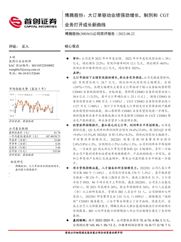 【首创证券】【20220822】博腾股份:大订单驱动业绩强劲增长,制剂和CGT业务打开成长新曲线-4页 行业研究