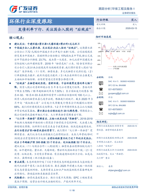 【广发证券】【20200315】环保行业深度跟踪:发债利率下行、关注国企入股的“后效应”-10页 行业研究