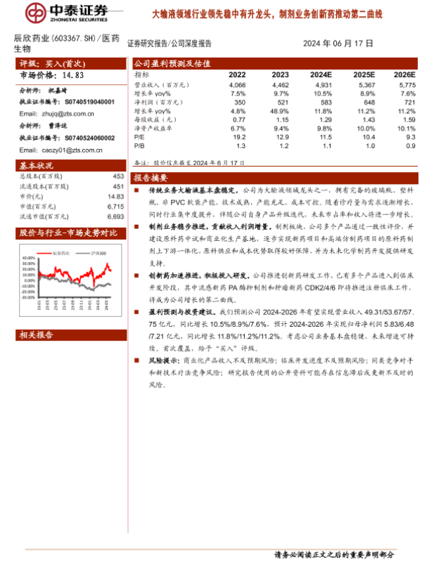 【中泰证券】【20240617】20240617-中泰证券-辰欣药业-603367.SH-大输液领域行业领先稳中有升龙头,制剂业务创新药推动第二曲线-18页 行业研究