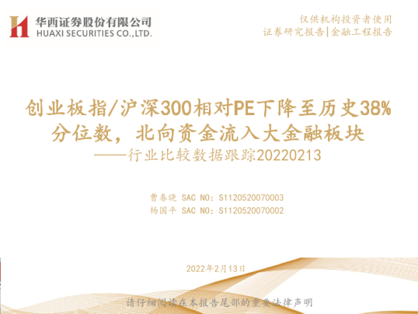 【华西证券】【20220213】行业比较数据跟踪:创业板指沪深300相对PE下降至历史38%分位数,北向资金流入大金融板块-23页 行业研究