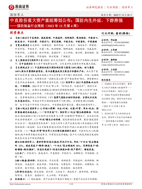 【浙商证券】【20221224】国防装备行业周报(2022年12月第4周):中直股份重大资产重组筹划公布;国防内生外延、下游渐强-10页 行业研究