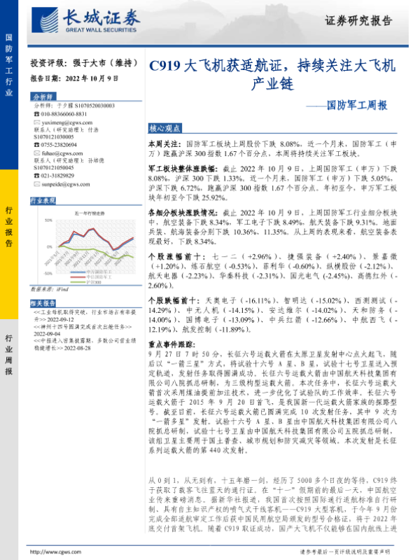 【长城证券】【20221009】20221009-长城证券-国防军工周报:C919大飞机获适航证,持续关注大飞机产业链-14页 行业研究