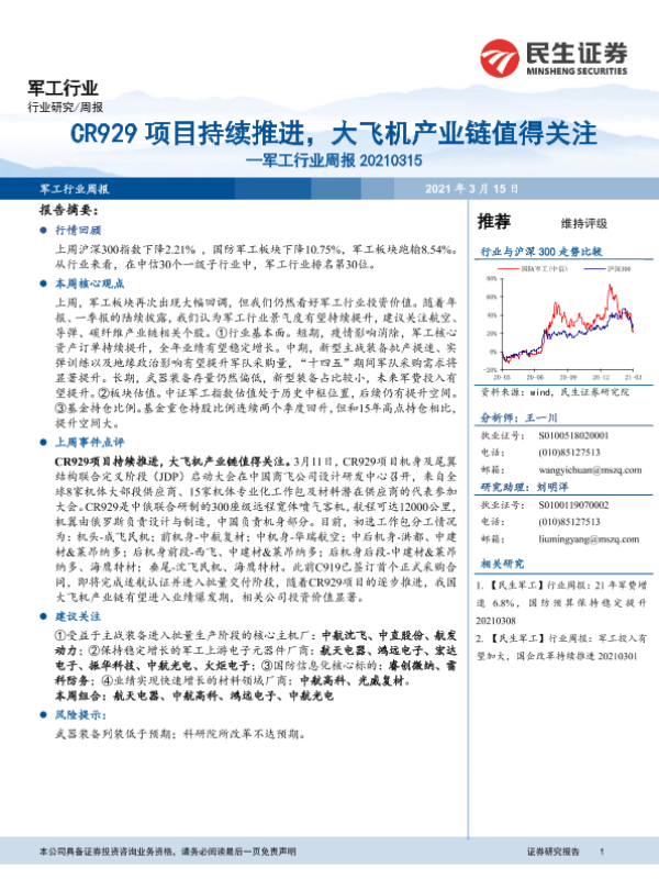 【民生证券】【20210315】20210315-民生证券-军工行业周报:CR929项目持续推进,大飞机产业链值得关注-17页 行业研究