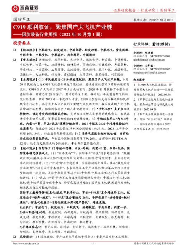 【浙商证券】【20221009】国防装备行业周报(2022年10月第1周):C919顺利取证,聚焦国产大飞机产业链-11页 行业研究