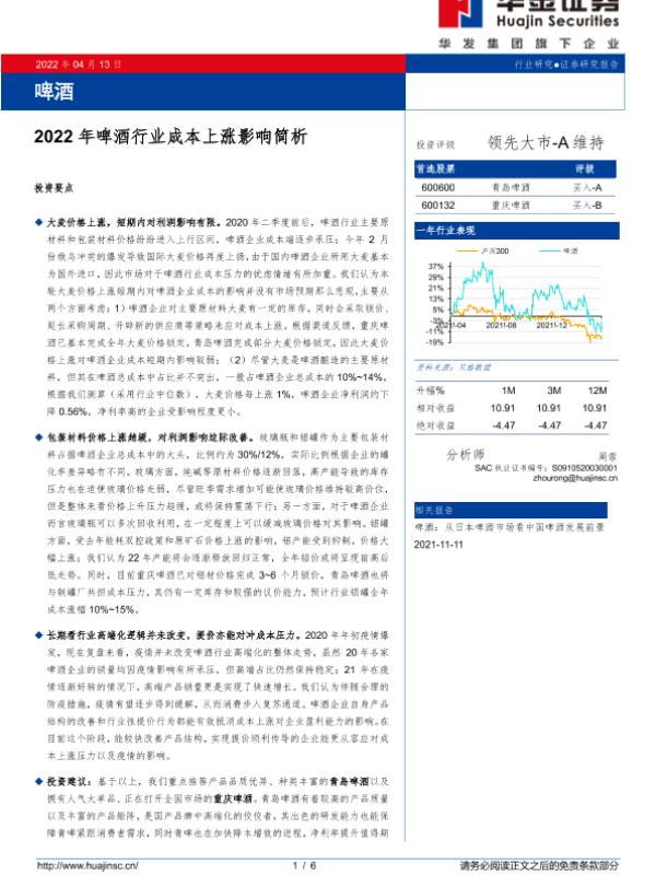 【华金证券】【20220413】2022年啤酒行业成本上涨影响简析-6页 行业研究