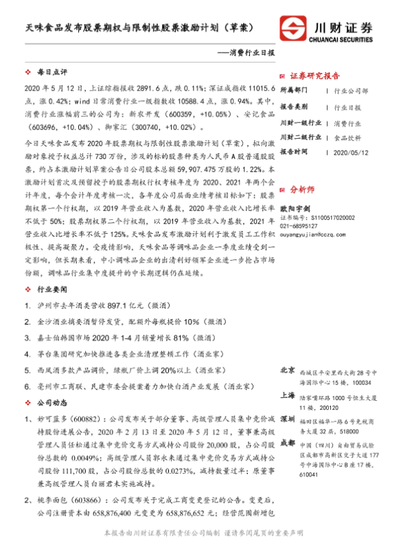 【川财证券】【20200512】天味食品发布股票期权与限制性股票激励计划(草案)-3页 证券期货研究报告