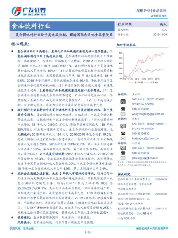 【广发证券】【20191124】食品饮料行业深度分析:复合调味料行业处于高速成长期,颐海国际和天味食品最受益-31页 行业研究