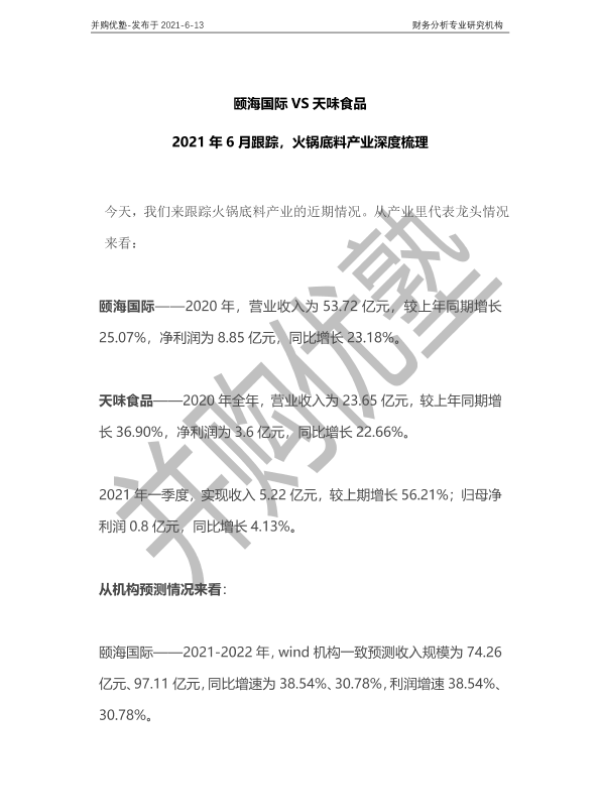 【并购优塾】【20210613】2021年6月跟踪,火锅底料产业深度梳理:颐海国际VS天味食品-20页 行业研究