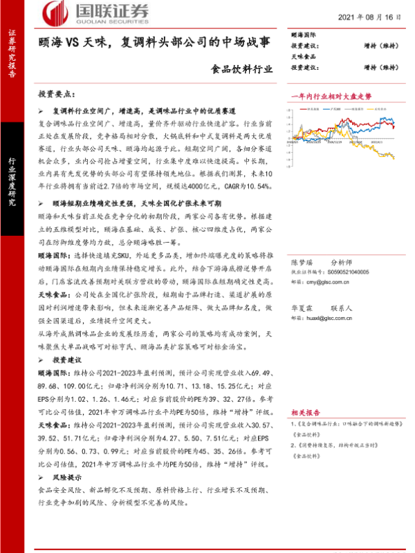 【国联证券】【20210816】食品饮料行业:颐海VS天味,复调料头部公司的中场战事-60页 行业研究