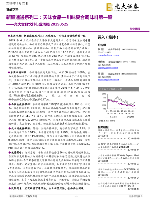 【光大证券】【20190526】20190526-光大证券-光大食品饮料行业周报:新股速递系列二:天味食品—川味复合调味料第一股-27页 行业研究