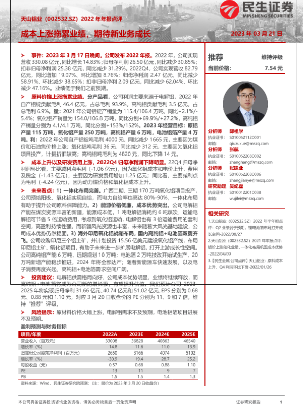 【首创证券】【20220718】20220718-首创证券-天山铝业-002532.SZ-公司深度报告:低电力成本优势稳固 新建项目步入释放期推升成长空间-23页 行业研究